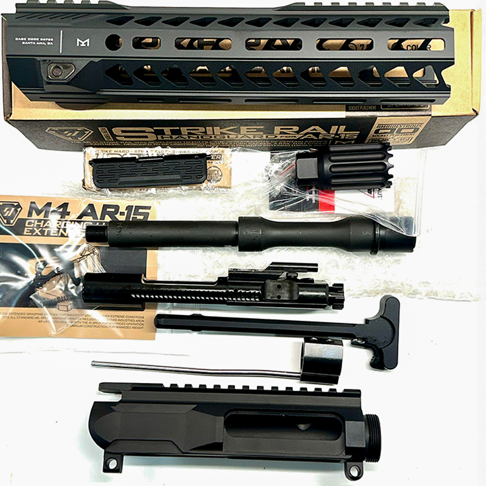 T6 aerospace-grade billet CNC aluminum upper receivers, hard-coat anodized black for durability, replace standard forged receivers here to provide superior rigidity and refined fit-and-finish for OEM-level performance. The package includes a charging handle w/ Strike extended latch and a Strike dust cover for dependable operation and protection.